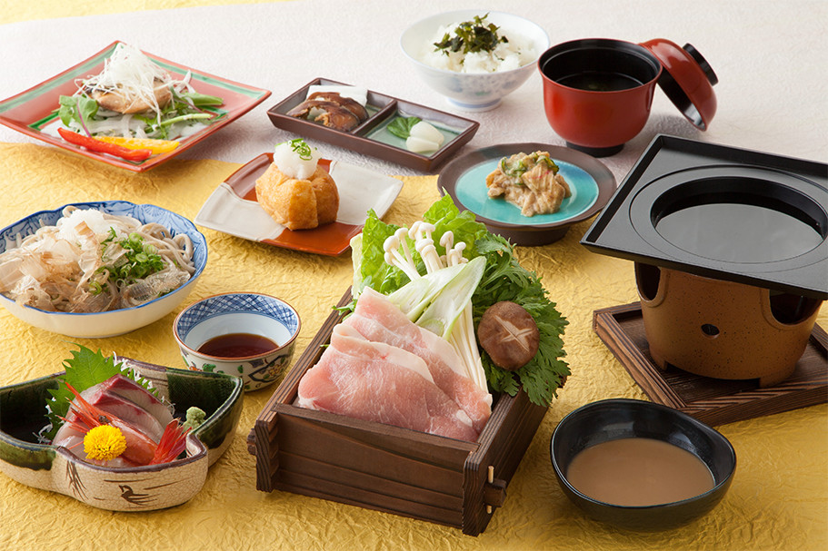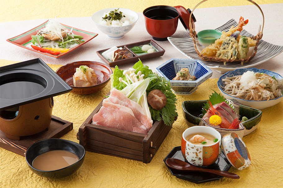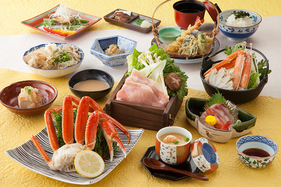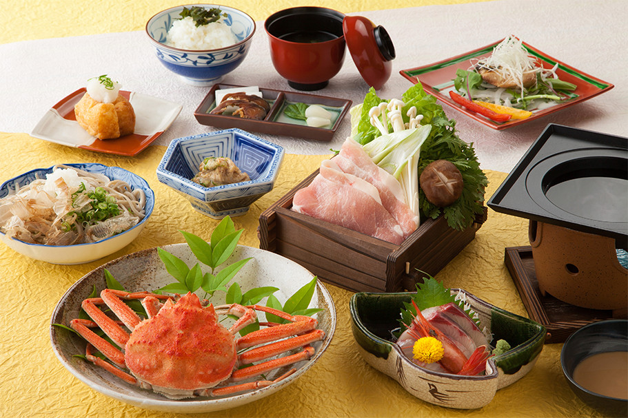 ゆでズワイガニ、かに鍋、季節の天ぷら、茶碗蒸し、福井の野菜とポークの蒸し料理、お造り3種、福井名物手打ちそば、福井名物焼き厚揚げ、伝承料理からし麩、へしこ、三国のらっきょ、季節の焼き物、越前わかめごはん、汁物